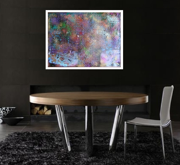 A new mix-media, glossy finish painting. Colours, layers and textures are sealed under a layer of resin. Framed with chunky white painted wood.